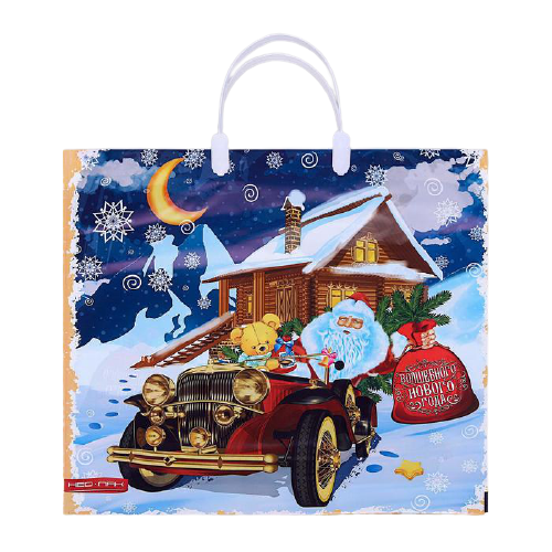 Пакет с пластиковой ручкой новогодней тематики, размер 37*35*5 см. Красивый плотный пакет подходит для использования в быту и как подарочная упаковка.