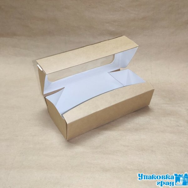 Контейнер из целлюлозного крафт-картона с окном. Размер: 170*70*40мм. Подходят для десертов, суши, роллов, фастфуда, "еды на вынос". Возможно использовать в СВЧ. В коробе 250 шт.