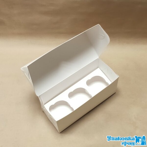 Коробка для 3 капкейков, размер 250*100*100 без окна. Самосборная и легкая, не требует дополнительного скрепления. Ложемент внутри выполнен под каждый капкейк, что позволит не соприкасаться с соседними продуктами и стенками коробки. Упакован в коробе по 100 шт.