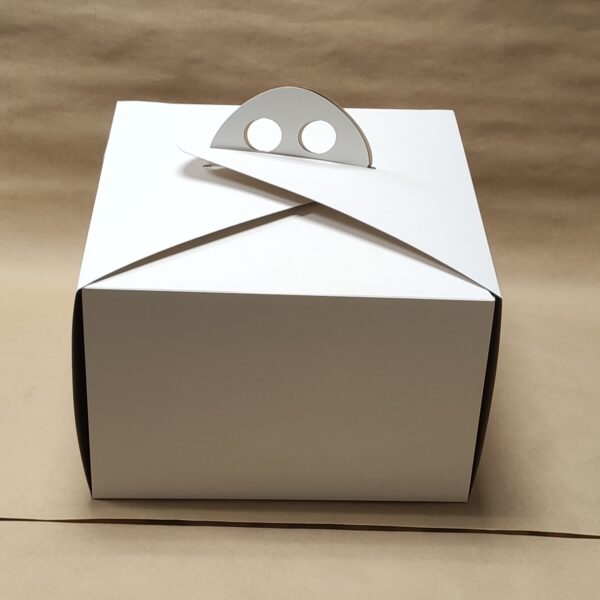 Коробка белая с окном, размер 240*240*220см. Используется для упаковки, хранения и транспортировки кондитерских изделий. Внешний вид изделия можно оценить через окно сверху. На дне упаковки имеются вырезы для надежного крепления упаковочной ленты. Коробка помогает хранить изделие экологично и компактно.