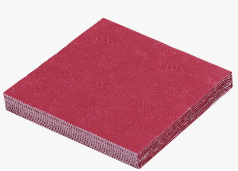 Салфетки бумажные 3-х слойные 16 листов, Барокко малиновый, используются на предприятиях общественного питания: закусочных, столовых, кафе, кофейнях, ресторанах, а также для банкетов, фуршетов, для оформления праздников и сервировки стола.