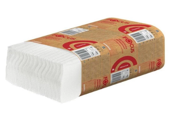 Бумажное полотенце Focus, 100 листов, Z сложение, двухслойное, в составе целлюлоза. Используется для поддержания гигиены в общественных местах.