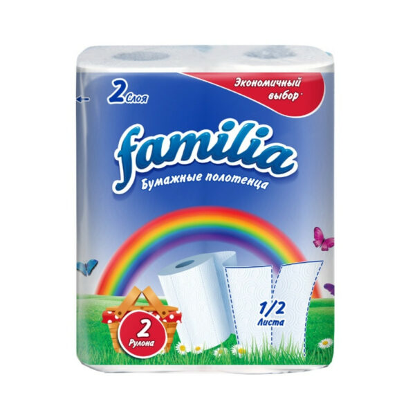 Двухслойные бумажные полотенца Фамилия изготовлены из качественного сырья. Обладают отличными впитывающими свойствами и прочностью. В упаковке 2 рулона. Полотенца бумажные Фамилия - незаменимый помощник в каждом доме.