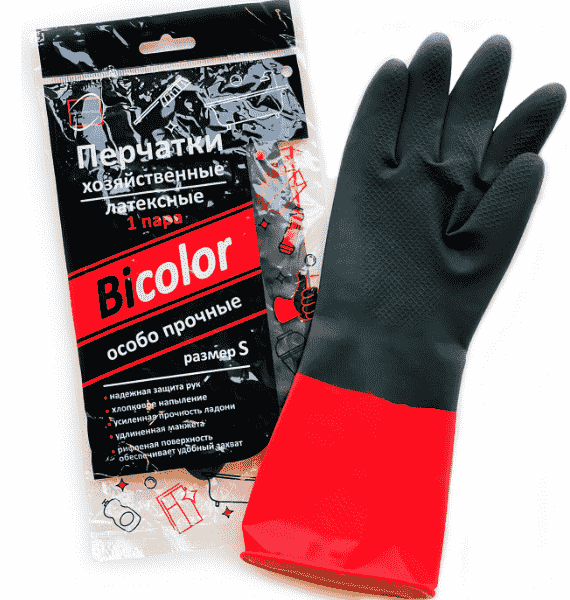 Перчатки латексные «Биколор» S черно-красные (12пар/уп/240 КП) предназначены для выполнения хозяйственных, садовых и строительных работ. Перчатки обеспечивают защиту рук от воды, растворов нетоксичных веществ, бытовых химикатов и загрязнений.