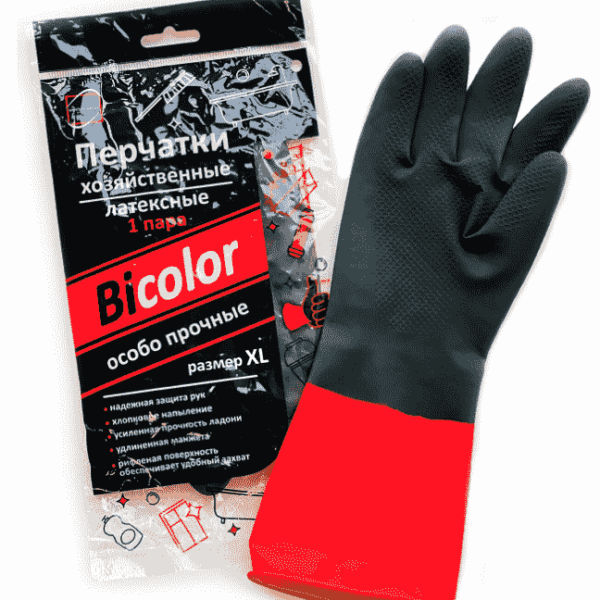 Перчатки латексные «Биколор»XL черно-красные (12пар/уп/240 КП) предназначены для выполнения хозяйственных, садовых и строительных работ. Перчатки обеспечивают защиту рук от воды, растворов нетоксичных веществ, бытовых химикатов и загрязнений.