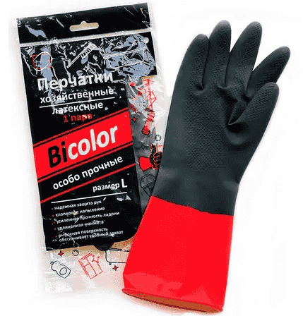 Перчатки латексные «Биколор» L черно-красные (12пар/уп/240 КП) предназначены для выполнения хозяйственных, садовых и строительных работ. Перчатки обеспечивают защиту рук от воды, растворов нетоксичных веществ, бытовых химикатов и загрязнений.
