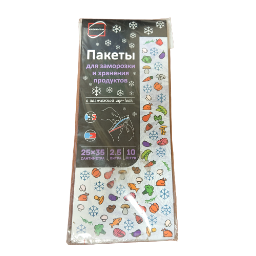 Пакеты для заморозки (зип-лок) размер 25*35см, количество 10штук. Используются для заморозки фруктов, овощей, зелени, мясных и рыбных продуктов.