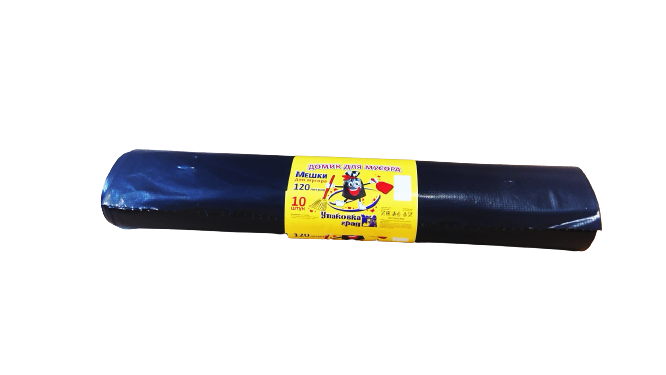 Пакет для мусора черный в рулоне. Объем 120 литров. Количество пакетов в рулоне 10 штук. Идеально подходит для использования в быту, в учреждениях образования, здравоохранения, общественного питания.