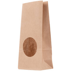 Пакет бумажный изготовлен из плотной 2-х слойной Крафт бумаги с прозрачным окном. Размер 100*70*60*200 мм. Используется для упаковки продуктов питания, косметики, сувениров.