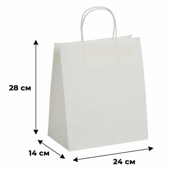 Пакет бумажный белый крафт с крученными ручками, размер 240*140*280мм Используется для упаковки и транспортировки различных товаров. Благодаря плотной бумаге, пакет обладает высокой прочностью и отлично держит форму.