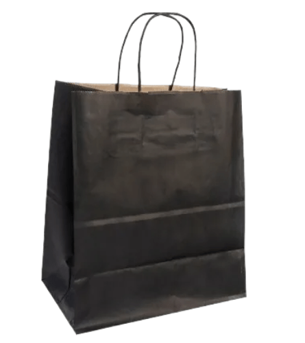 Пакет бумажный с кручеными ручками, черный, из первичного сырья. Размер 240*140*280мм. Служит для упаковки товаров различных категорий: одежды, обуви, сувениров, аксессуаров, книг, а так же пищевых продуктов. Для изготовления пакетов с кручёными ручками используют обёрточную крафт-бумагу плотностью 70 г/м². Ручки делают из скрученного шпагата, который приклеивают к пакету. Бумажные пакеты с кручёными ручками экологичны, их можно использовать многократно.