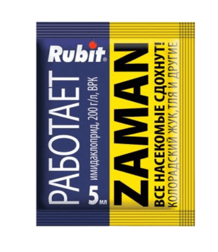 Средство «Заман» (ампула 5 мл) используется для уничтожения колорадского жука и его личинок, а также тли.Препарат обладает острым контактным и системным действием, обеспечивает длительную защиту от вредителей. Он устойчив к смыванию дождём и действию высоких температур. Обработку растений следует проводить ранним утром или поздним вечером при температуре воздуха ниже 15°С и скорости ветра не более 1–2 м/с. Препарат высокоопасен для пчёл.