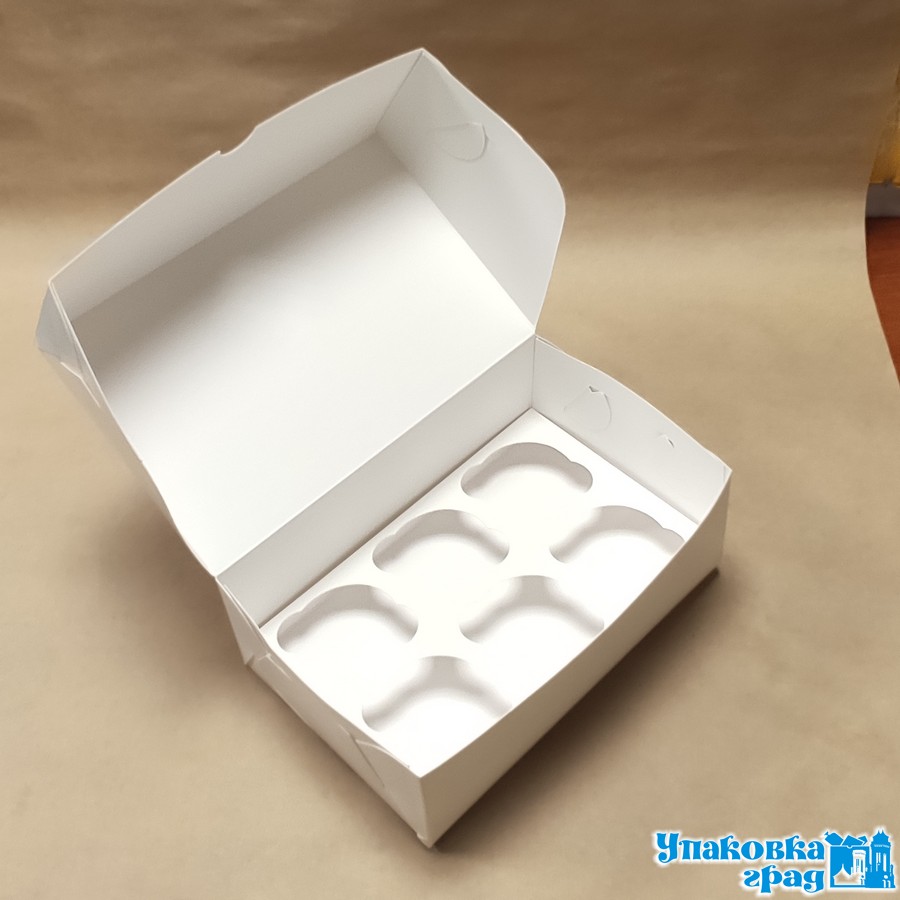 Коробка для 6 капкейков, размер 250*170*110 без окна. Самосборная и легкая, не требует дополнительного скрепления. Ложемент внутри выполнен под каждый капкейк, что позволит не соприкасаться с соседними продуктами и стенками коробки. В коробе 100 шт.