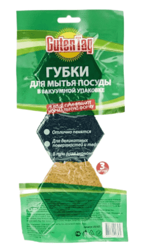 Губки для посуды «Тефлончик» в вакуумной упаковке Guten Tag предназначены для мытья посуды, в том числе деликатных поверхностей и тефлона.