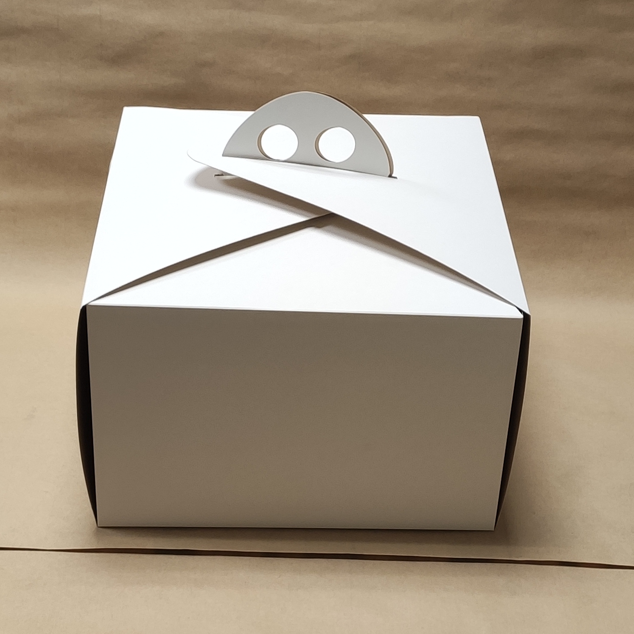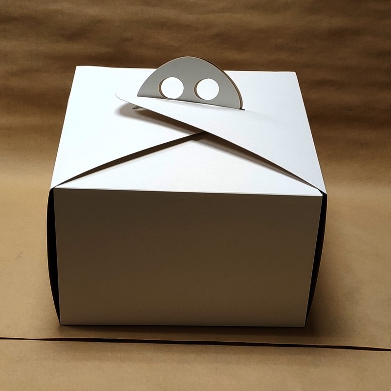 Коробка для торта из серии «Fupeco WinCakeHandBox» с ручками и прозрачными окнами размером 300×300×250 мм. Коробка предназначена для торта диаметром 29 см и высотой 23–24 см, вмещает от 1 до 3 кг (диаметр от 15 до 30 см).