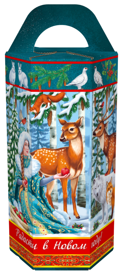 Коробка НГ 1300г В гостях у сказки (шестигранник) 70шт/УФ/ТП