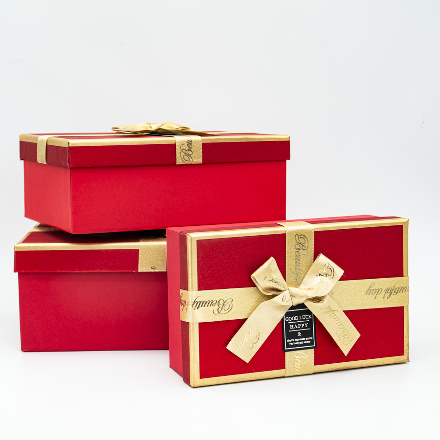 Набор коробок 3в1 прямоугольник 23х16х9,8/ 21х14х8/ 19х12х6,5см, с бантом, красный с золотом
