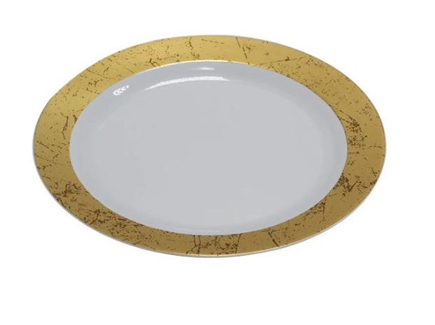 Тарелка одноразовая, мелкая, белого цвета с каемочкой под золотой мрамор, изготовлена из полипропилена, диаметр 190 мм, в упаковке 6 штук. Прекрасно подойдет для праздников, вечеринок, корпоративных мероприятий, пикников.