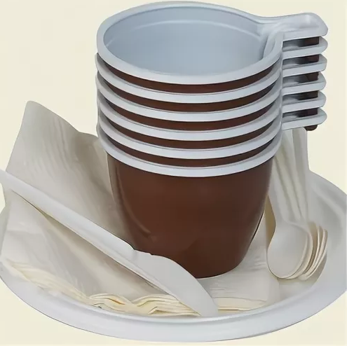 Набор одноразовой посуды "Кофе с молоком": тарелка 170мм, чашка кофейная 200мл, салфетка, ложка чайная, нож 1 шт. Используется для холодных и горячих пищевых продуктов. Подходит для разных мероприятий, пикников, туристических походов.