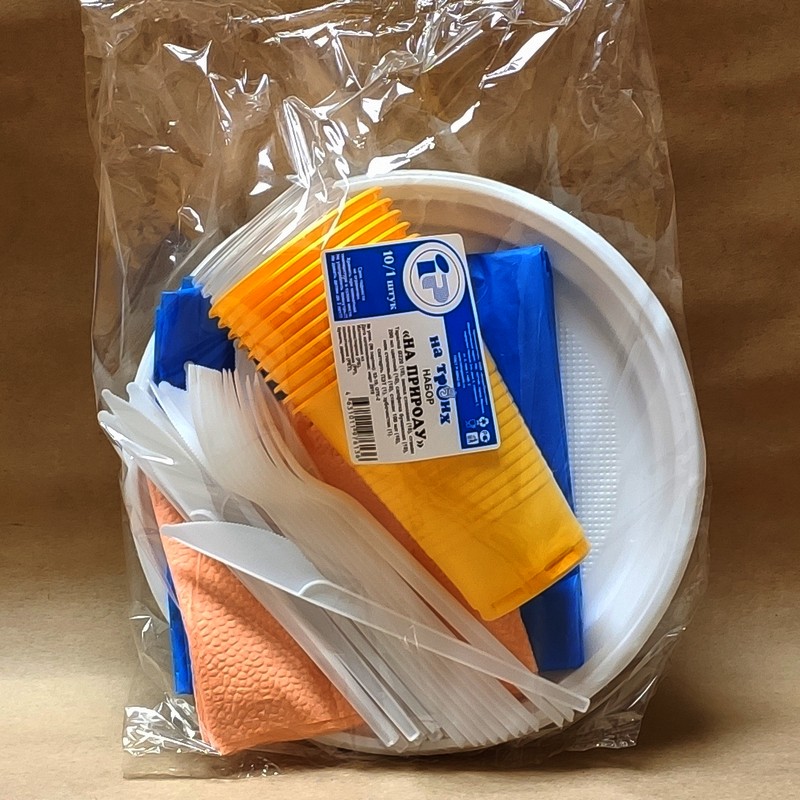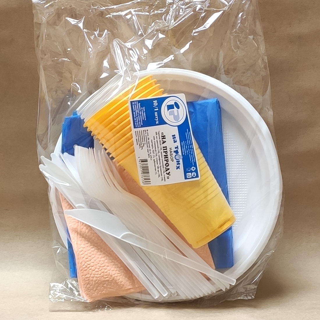Набор одноразовой посуды “На природу” на 10 человек: тарелка 205мм, стакан цветной 200мл, салфетка, вилка, нож, стакан 100 мл, скатерть 1 шт, зубочистки. Используется для холодных и горячих пищевых продуктов. Подходит для разных мероприятий, пикников, туристических походов.