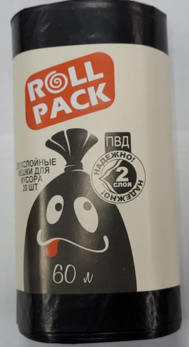 Мешки для мусора РОЛЛ ПАК 60л, 20штук в рулоне. Двухслойные надежные мешки изготовлены из полиэтилена высокого давления (ПВД). Идеально подходит для использования в быту, в офисах, в учреждениях образования, здравоохранения.