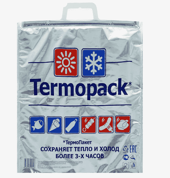 Термопакет «Фольга/ПВД» 32×35 см предназначен для доставки и сохранения замороженных, охлаждённых и горячих продуктов. Пакет сохраняет тепло и холод более 3 часов. Материалы: внутренний слой — ПВД, внешний — металлизированная плёнка, средний — теплоизоляционный.