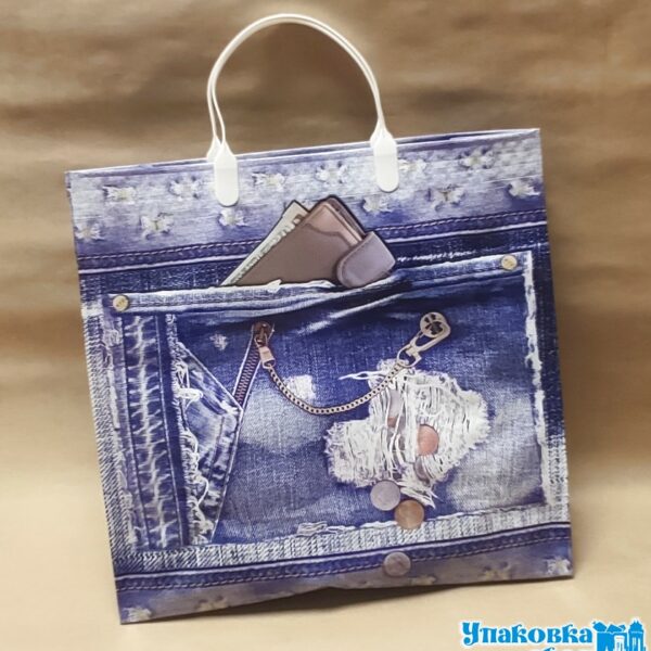 Пакет ламинированный многослойный с оригинальным дизайном. В дно пакета впаяна донная складная вставка, которая усиливает прочность и дает возможность поставить его при необходимости, внутри и снаружи есть пара карманов. Пакет легко сложить и взять с собой в сумочку.