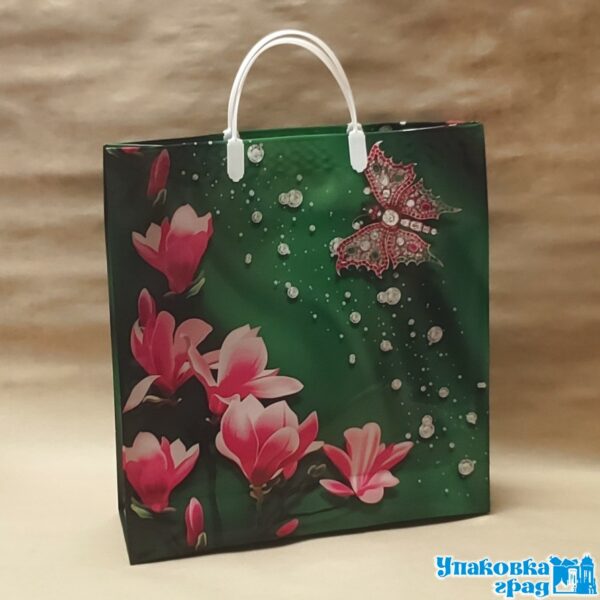 Пакет глянцевый с пластиковой ручкой, размер 40*40*5 см. Красивый плотный пакет подходит для использования в быту и как подарочная упаковка.