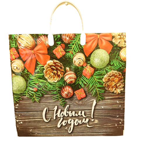 Пакет праздничный новогодний с пластиковой ручкой, размер 36*34*5 см. Используется как оригинальная удобная упавковка для подарка.