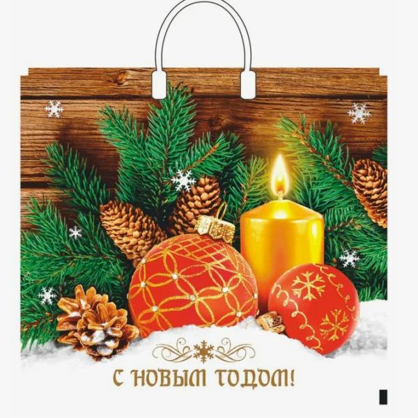 Пакет новогодний праздничный с пластиковой ручкой, размер 38*35*10 см. Красивый плотный пакет подходит для использования в быту и как подарочная упаковка. Продается по 10 штук.