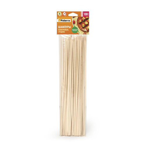 Шампуры из бамбука, длина 25см, количество в упаковке 100 шт. Используются для приготовления мини-шашлыков, овощей на гриле, углях, а так же в духовке, микроволновке. Экологически безопасны, не меняют вкус продуктов.