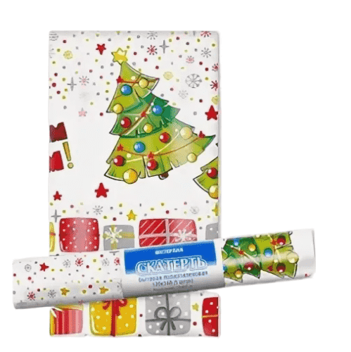 Новогодняя одноразовая скатерть в рулоне. Изготовлена из полиэтилена, размер 120*160см, в рулоне 5 штук (разделяются по перфорации), плотность 35мкм. Скатерть станет отличным украшением для праздничного стола.