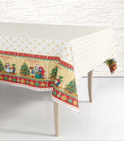 Новогодняя одноразовая скатерть в рулоне. Изготовлена из полиэтилена, размер 120*160см, в рулоне 5 штук (разделяются по перфорации), плотность 35мкм. Станет отличным украшением для праздничного стола.