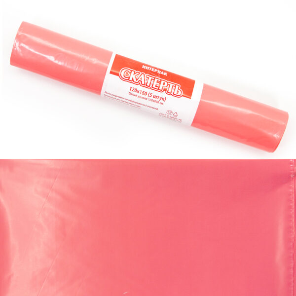 Скатерть одноразовая в рулоне. Изготовлена из полиэтилена, размер 120*160см, в рулоне 5 штук (разделяются по перфорации), плотность 35мкм. Станет отличным украшением для праздничного стола на любом мероприятии.