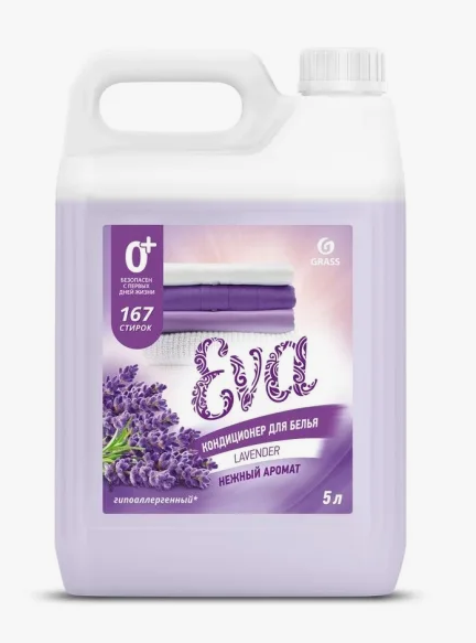 Кондиционер для белья EVA Лаванда 5л. Снимает статическое напряжение, облегчает глажение, придает белью мягкость и длительный приятный аромат.