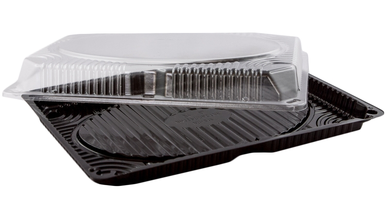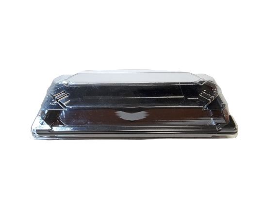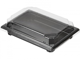 Контейнер СП-25 используется в качестве упаковки для суши и роллов, также подходит для фасовки восточных сладостей, готовой кулинарии. Изготовлен из ПЭТ черного цвета. Размер 242х168х30 мм.