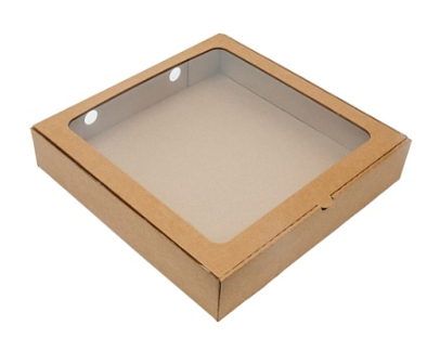 Бурая картонная коробка размером 280×280×70 мм с окном (Д25–28) подходит для упаковки пирогов, а также других кондитерских изделий, таких как пицца, пряники, печенье. Прочный материал коробки обеспечивает сохранность продукции во время транспортировки и хранения.