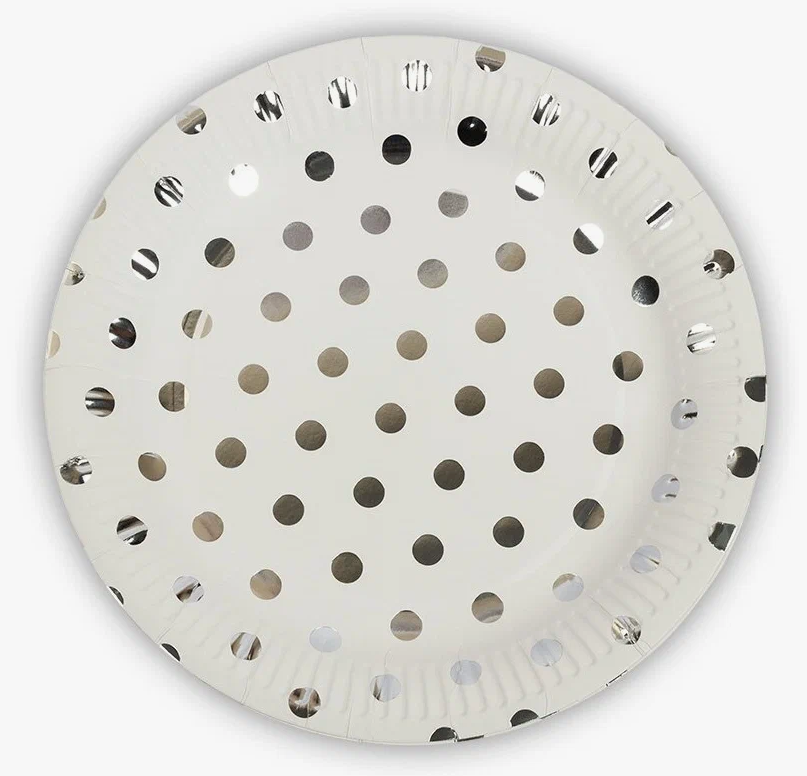 Набор одноразовых картонных тарелок Люкс Горох серебро,количество 10 штук, диаметр 220мм. Экологичная посуда добавит настроение торжеству, украсит фуршет, выездное мероприятие, корпоратив и детский праздник. Набор тарелок удобно взять с собой на пикник, в поход, на прогулку.