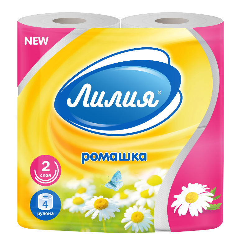 Туалетная бумага “Лилия” двухслойная ароматизированная с перфорацией и тиснением, изготовлена из основы санитарно-гигиенического назначения. Аромат: ромашка. В упаковке 4 рулона.