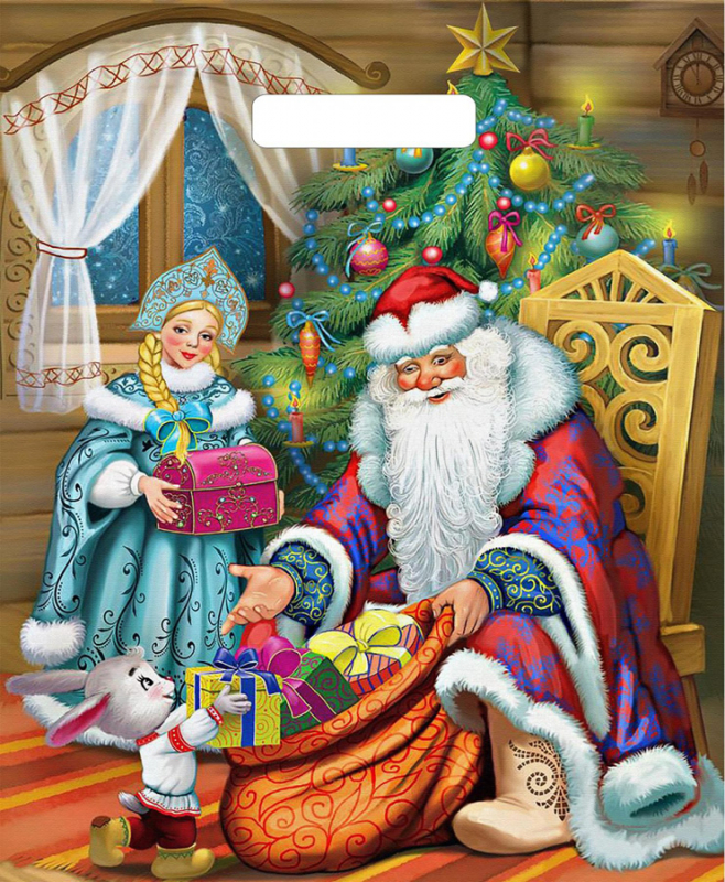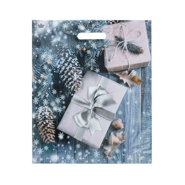 Новогодний пакет с вырубной ручкой, размер 38*45+5см служит для упаковки небольших подарков, предметов одежды, продуктов.