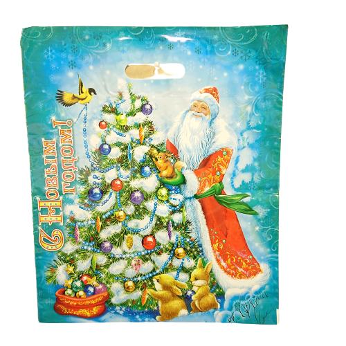 Новогодний пакет с вырубной ручкой, размер 38*45см, плотность 60мк. Пакет служит для упаковки косметических средств, небольших подарков, игрушек. Продается по 50 штук.